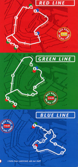 Le linee Verdi, Rosse e Blu, contrassegnano i percorsi (Pdf) che potrete seguire per spostarvi in città, come si farebbe con quelli di una metropolitana. Gli orari (Pdf) di partenza per le varie fermate, in tutto 14, sono anche molto frequenti e sono localizzate nei pressi delle maggiori Attrazioni, Centri Commerciali e Musei. Con un biglietto giornaliero, il Day Pass che costa 16 Euro (2006), è possibile usufruirne quante volte si vuole nell'arco della giornata, ed è valido fino alle 12.00 del giorno dopo. Altre tipologia di biglietto sono l' 'Amsterdam Transport Pass' e il 'Combi Tickets', senza dimenticare l'I Amsterdam Card. L'acquisto di questo tipo di biglietto consente di avere degli sconti per l'ingresso a Musei e Attrazioni.